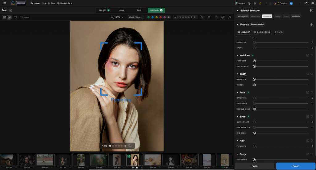 The retouching side is equally packed with AI features. You can use subject selection to specify which person to focus on, which is especially useful in group portraits. Aftershoot offers its own preset library, and you can also create your own to cover different scenarios.