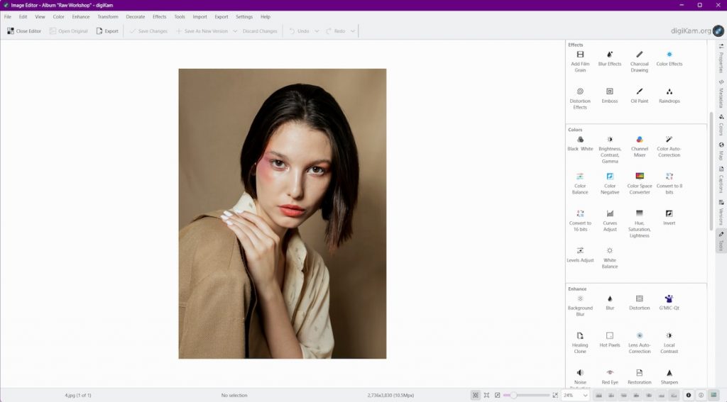 The editing tools inside digiKam go beyond simple touch-ups. Users can make color corrections, retouch images, and apply transformations directly within the same platform, eliminating the need to export to another editor. While it doesn’t match Lightroom’s depth of local adjustments or AI masking, digiKam’s editing suite still provides enough control for everyday post-processing and creative work.
