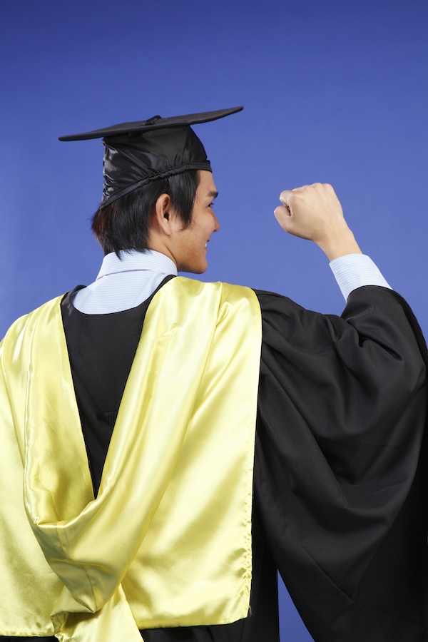 Photograph the graduate from behind as they look slightly to the side, raising a fist in the air. This graduation photo pose highlights the cap and gown from the back while capturing a powerful sense of accomplishment. It works well against open skies, school buildings, or even in the studio, creating a strong and uplifting image.