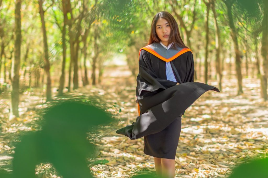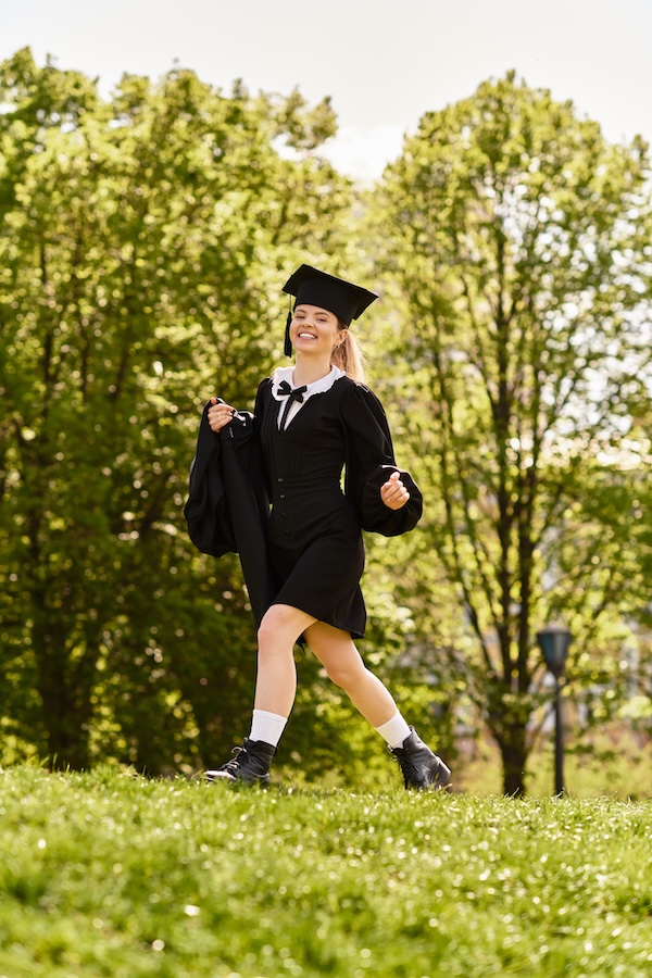 Photograph the graduate outdoors in a natural setting such as a tree-lined path, park, or open field. Have them stand or walk while the wind catches their gown, creating a flowing, dynamic effect. If there’s no natural breeze, use a fan or have someone give the gown a quick lift just before the shot. This graduation pose captures movement, freedom, and a sense of stepping into the future.