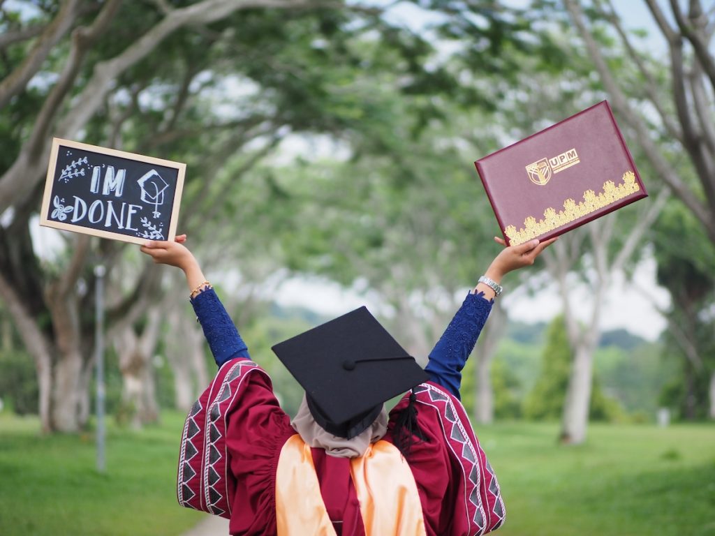 Photograph the graduate from behind while they hold the diploma in one hand and a small chalkboard sign in the other with a fun message like “I’m Done,” “Finally,” or “On to the Next Chapter.” The cap and gown from the back create a strong graduation silhouette, while the chalkboard adds a personal and playful touch. This graduation photo idea works beautifully outdoors or in front of meaningful school landmarks.