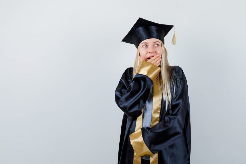 A proud pose where the graduate stands tall while holding the cap on their head with both hands, symbolizing the peak of their academic journey and the moment their hard work pays off.