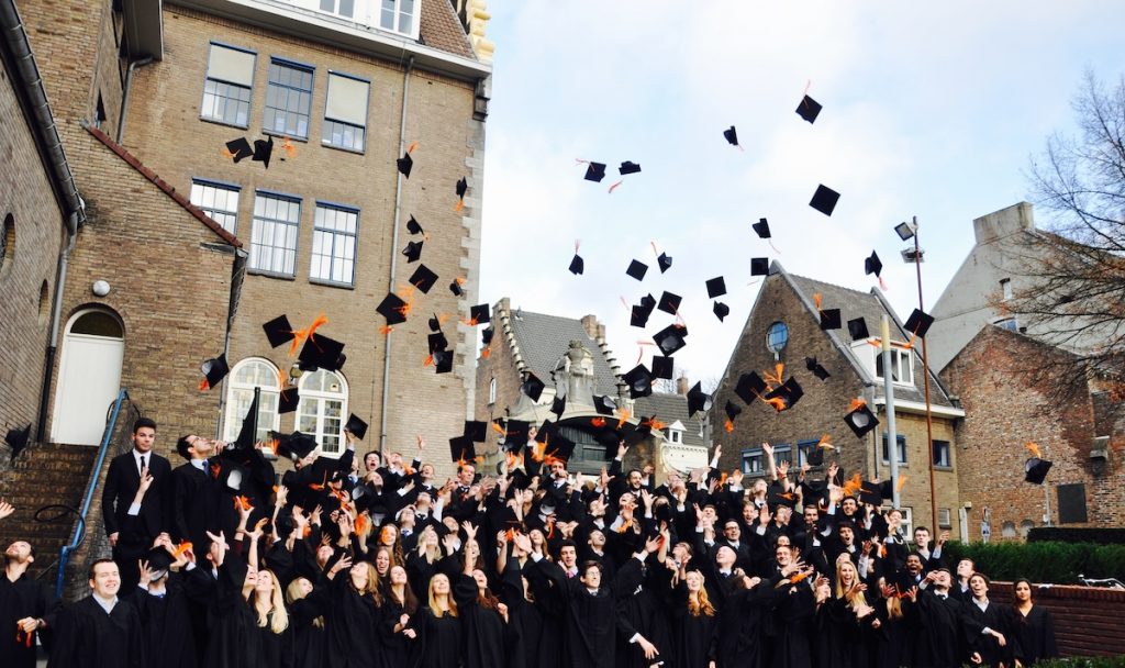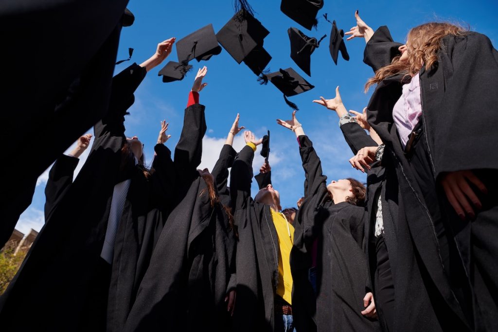Gather the entire graduating class or batch in an open space and have everyone toss their caps at the same time. Capture the moment from a slightly wide or elevated angle to include the whole group and the flurry of caps. This graduation photo idea radiates collective joy and creates a powerful, unforgettable image that symbolizes the end of a shared journey.