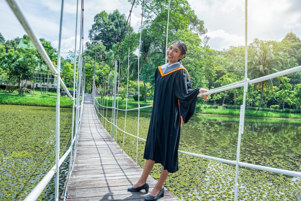 Capture the graduate in a joyful celebratory stance like jumping, tossing the cap, or striking a victory pose, then enhance the image with playful edits. Add confetti overlays, light flares, or motion blur to emphasize movement and excitement. You can also experiment with vibrant color grading or double exposure effects for a dynamic, eye-catching finish that gives the graduation photo a festive, modern vibe.