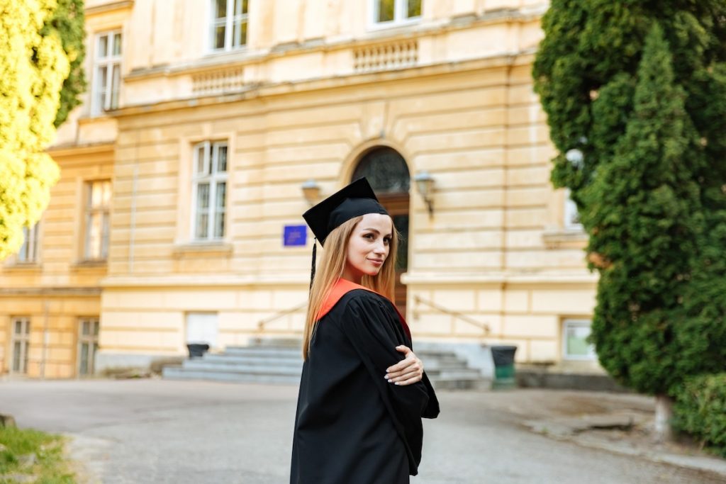 Have the graduate walk a few steps away, then turn their head back toward the camera with a soft smile or confident gaze. This graduation photo pose works beautifully along pathways, staircases, or hallways, especially when the gown flows naturally behind them. It captures a sense of reflection and anticipation, creating an elegant, timeless portrait.