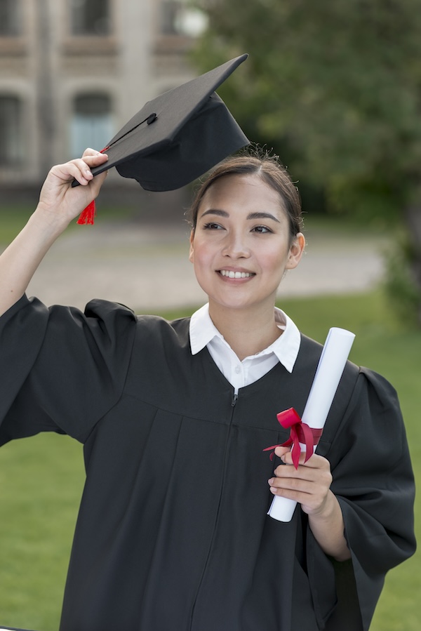 Have the graduate spread their arms wide and flash a big, genuine smile while proudly holding their diploma. This lighthearted pose radiates happiness and excitement, making it perfect for capturing the pure joy of graduation day.