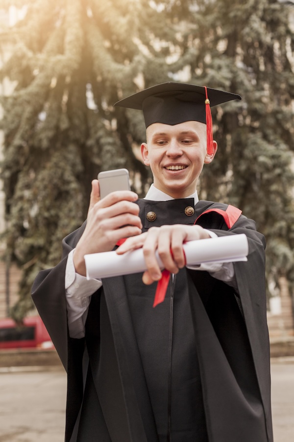 Have the graduate hold up their phone as if they’re on a video call with family or friends, showing off their cap, gown, and diploma to the screen. Capture their joyful expression as they wave, laugh, or proudly display their achievement. This pose reflects modern celebrations and is perfect for graduates sharing their milestone virtually with loved ones.