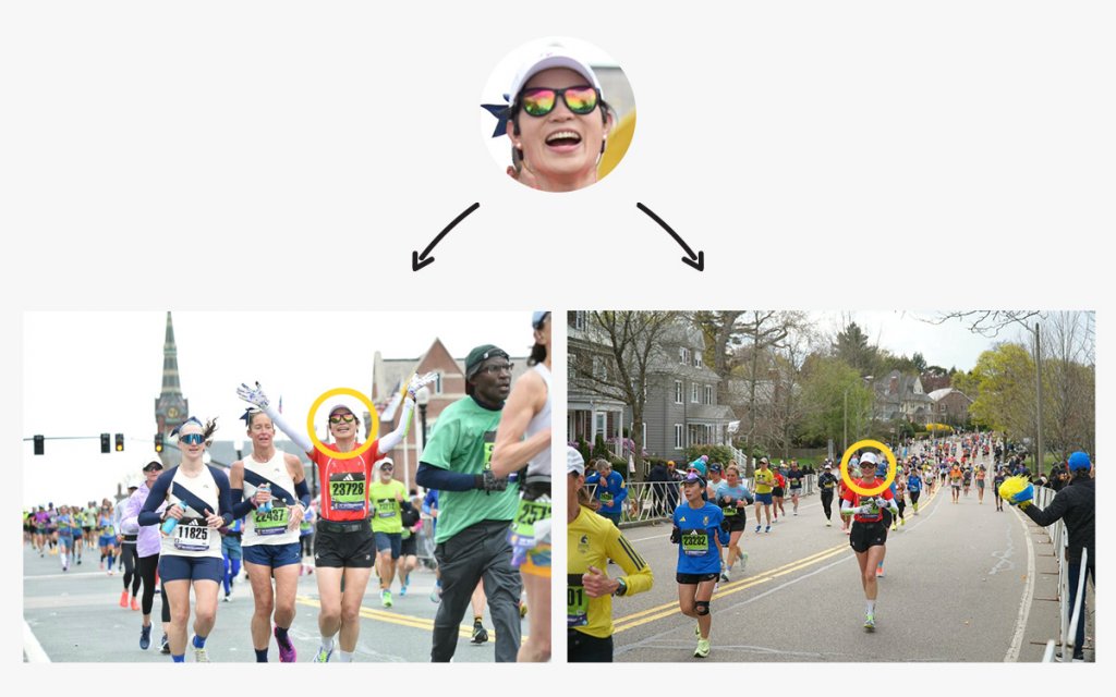 In this example, the subject is identified in a crowded race despite wearing a cap and sunglasses. Even when the face is smaller in the frame and partially obscured, the system is still able to match her correctly.