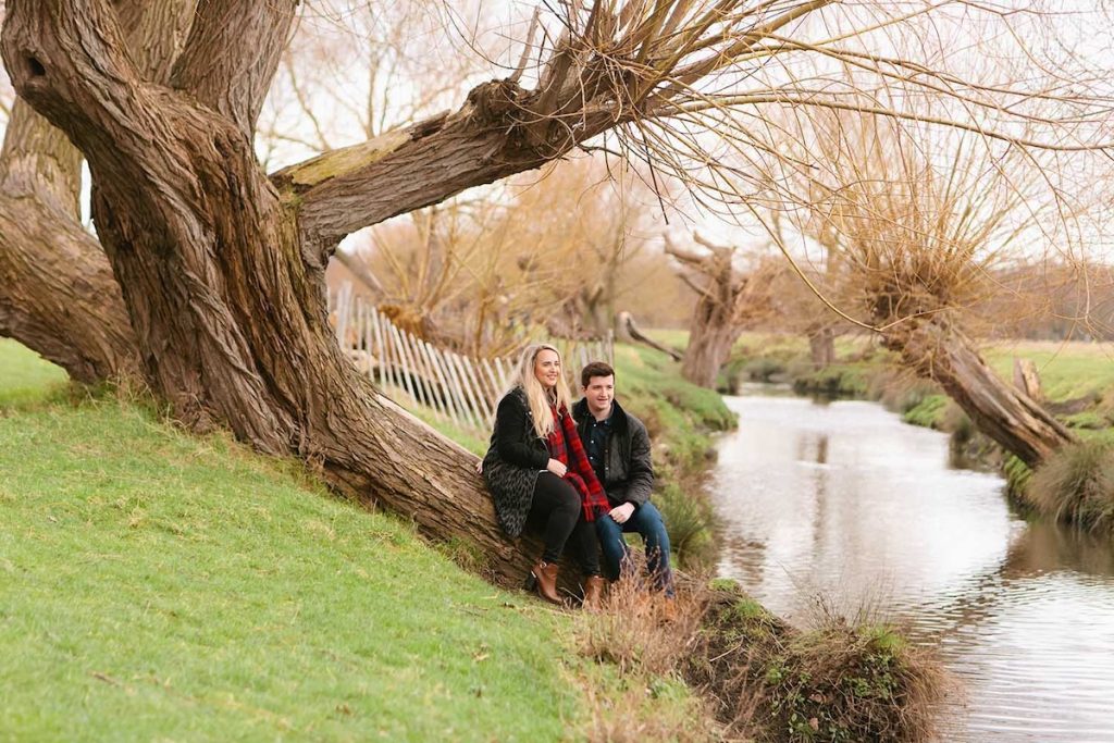 Behind the shot: Frame the couple on the tree with the river flowing behind. Use the curve of the riverbank to guide the eye, keep them close and relaxed, and shoot for soft expressions and small smiles that feel quiet and intimate.