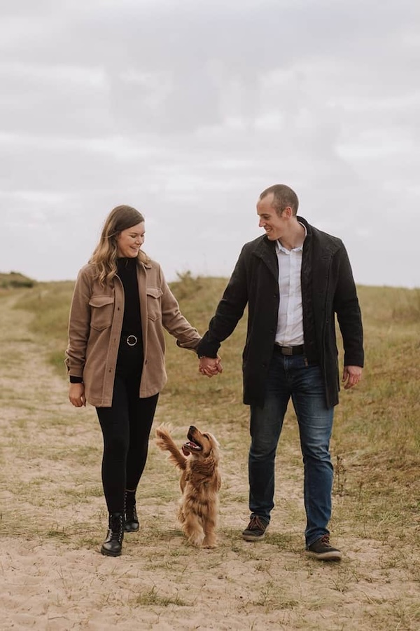 Behind the shot: Let the couple move at their own pace and interact naturally with each other and the dog. Watch for shared smiles, quick glances, and small reactions that capture the easy joy between all three.
