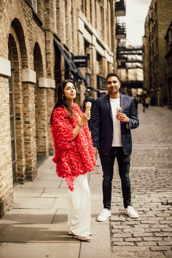 Behind the shot: Shoot from behind to capture the movement and their connection. Let their posture stay natural, using the contrast between the forward walk and the glance back, while keeping their hands linked to anchor the moment.