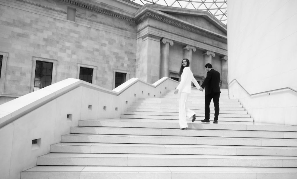 Behind the shot: Use the lines in the scene to naturally lead the eye toward the couple without overpowering them. Keep their posture relaxed and confident, and let the smiles and structure work together for a strong, balanced portrait.
