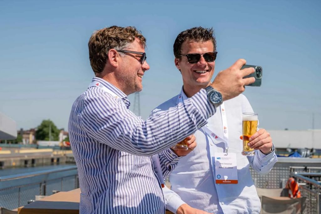 Behind the shot: Frame them closely to include the drinks and their expressions. Focus on genuine laughter and playful energy, whether they’re looking at the camera or the phone, highlighting the fun and friendly vibe of the networking event.