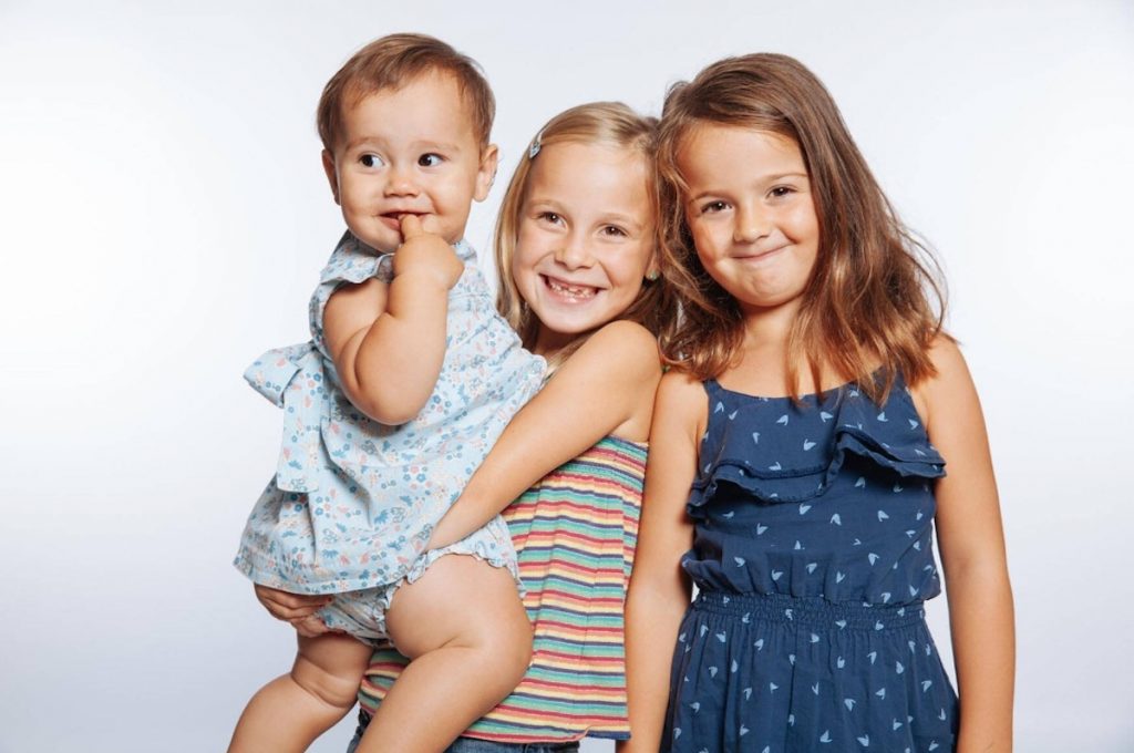 Prompt: “Big sisters, hold your baby sister close and give me a big smile.”