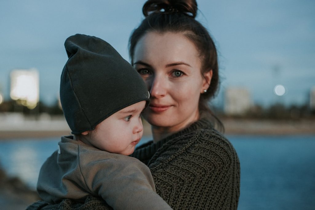 Behind the shot: Frame in close to keep the focus on their connection. Shoot for the contrast between the mother’s calm smile and the baby’s curious gaze, letting the moment feel quiet, warm, and heartfelt.