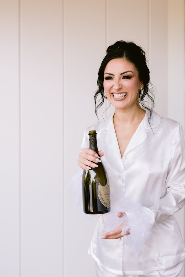 Behind the shot: Keep the bride’s posture relaxed and encourage small movements so the moment feels lively rather than posed. Watch for genuine laughter and bright expressions as she interacts casually with the bottle.