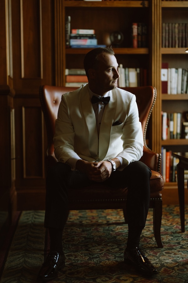 Behind the shot: Position the groom so the side light softly illuminates his face. Focus on the natural, contemplative mood, capturing the subtle details in his expression and posture for a serene, introspective portrait.