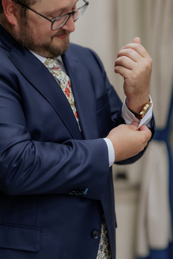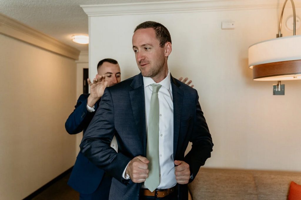 Behind the shot: Focus on the hands adjusting the sleeves and the genuine expression on the groom’s face. Capture the small, energetic gestures that convey anticipation and excitement naturally.