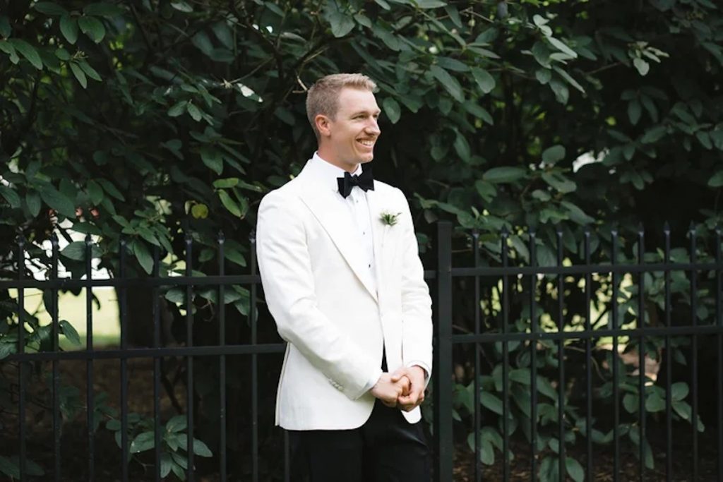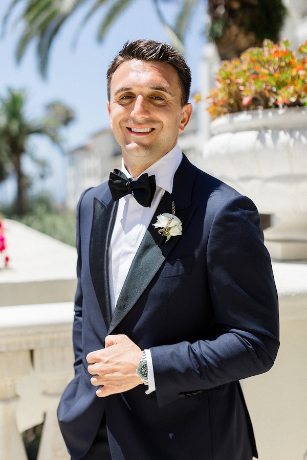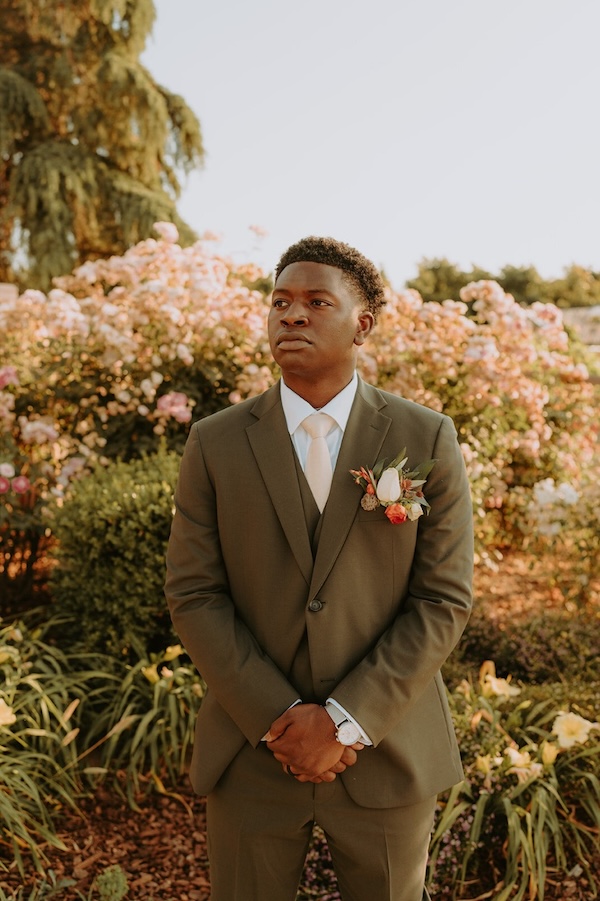 Behind the shot: Focus on the groom’s relaxed posture and natural expression. Let the small gesture of adjusting the jacket add personality while keeping the smile genuine and approachable.