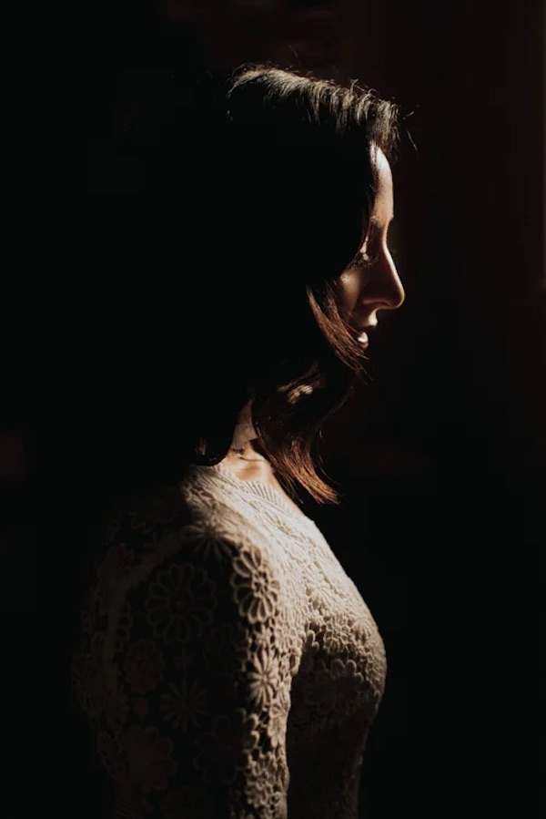 Prompt: “Step into the light by the window and look down for a moment, like you’re just taking a breath.”