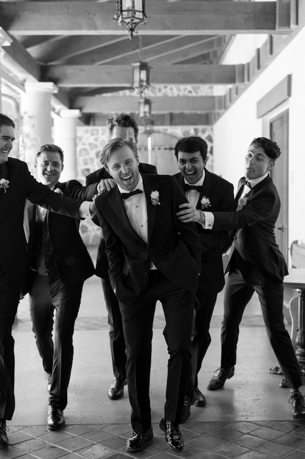 Behind the shot: Frame the groom in sharp focus while letting the best men remain slightly out of focus in the background. Capture the dynamic connection and playful energy between them, keeping expressions genuine and relaxed.