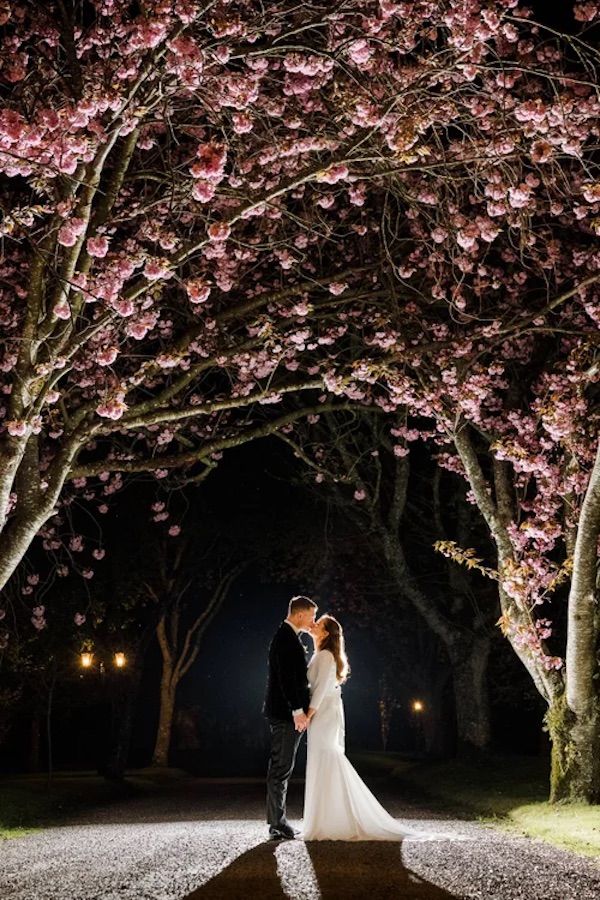 Behind the shot: Position the couple so the golden-hour light wraps gently around them. Use nearby trees or florals to frame the scene, letting the warm light and soft depth carry the mood while keeping the moment calm and timeless.
