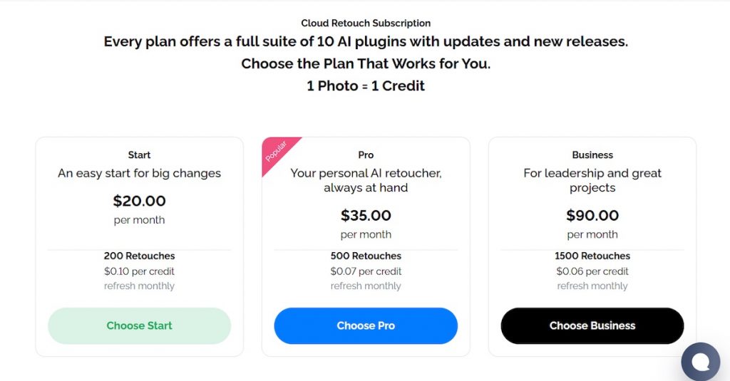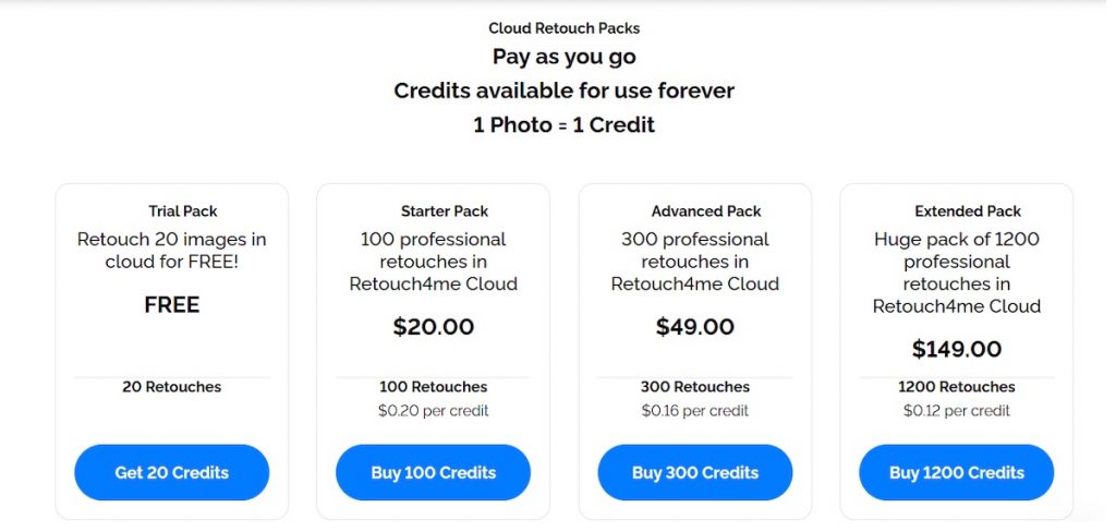 - Start: 200 retouches per month for $20 (at $0.10 per credit)