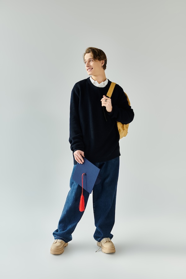 In a studio setting, pair a casual outfit with a graduation cap for a fun, relaxed twist on the classic graduation portrait. Have the senior stand or sit in a comfortable pose, letting their personality shine through while the cap adds a celebratory touch. This mix of formal and informal elements makes the senior portrait feel both polished and approachable.