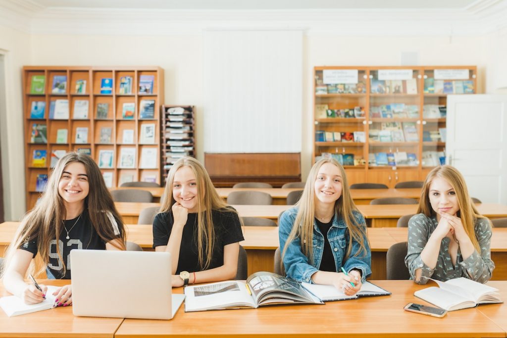 Use a classroom or library setting to create a warm, familiar atmosphere for a group portrait. Arrange the seniors close together, either sitting around a table or standing in a relaxed formation, to highlight their bond. This senior picture idea captures genuine connection and shared memories, making the photo feel personal and heartfelt.