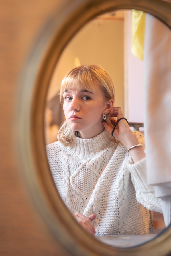 Incorporate a mirror into the scene to create a striking reflection. Position it so the senior’s face or body is partly visible in the mirror, and play with angles to get a balanced composition. This senior picture idea adds depth, visual intrigue, and a hint of introspection to the portrait.