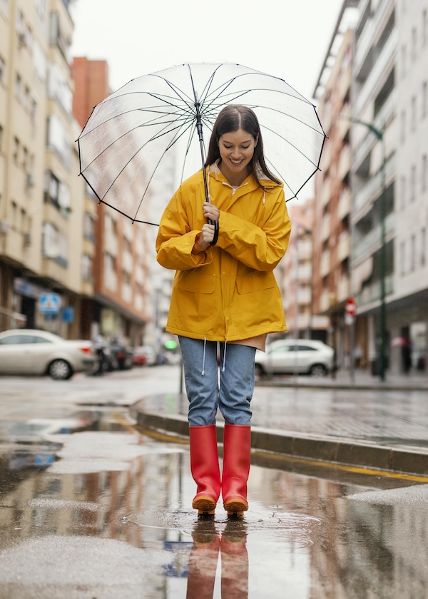 A clear umbrella together with the soft light after rain can create a beautifully romantic, cinematic mood. Place the senior beneath the umbrella or beside reflective puddles, letting the raindrops glimmer in the light. It’s an easy way to add atmosphere and texture while keeping attention on their expression.