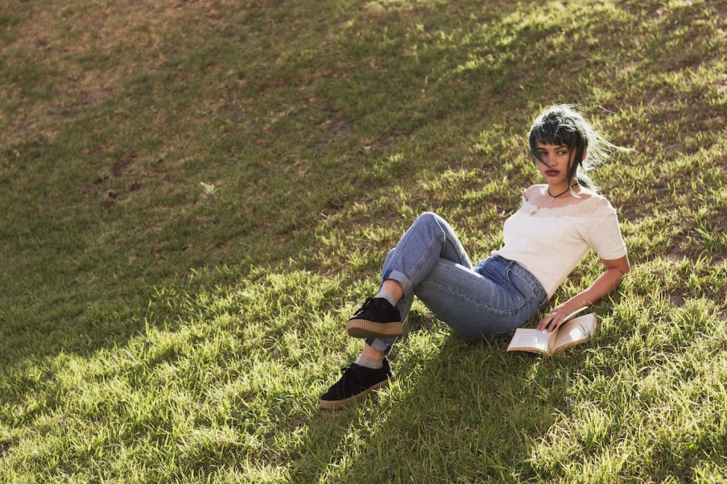 Find a clean spot for them to sit on, such as grass or pavement. Let them stretch their legs out or cross them casually. It adds intimacy and brings the background into the senior photo more effectively. You’ll often get great candid expressions from this low, grounded senior picture pose.