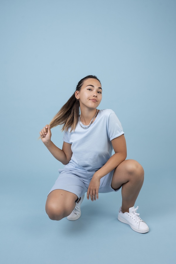 For a bold, dynamic portrait, have the senior take a low stance indoors by crouching or squatting. Shoot from a slightly lower angle to emphasize posture and presence, and have them look directly at the camera with a natural smile. This simple shift adds warmth and approachability while keeping the overall image modern and striking.