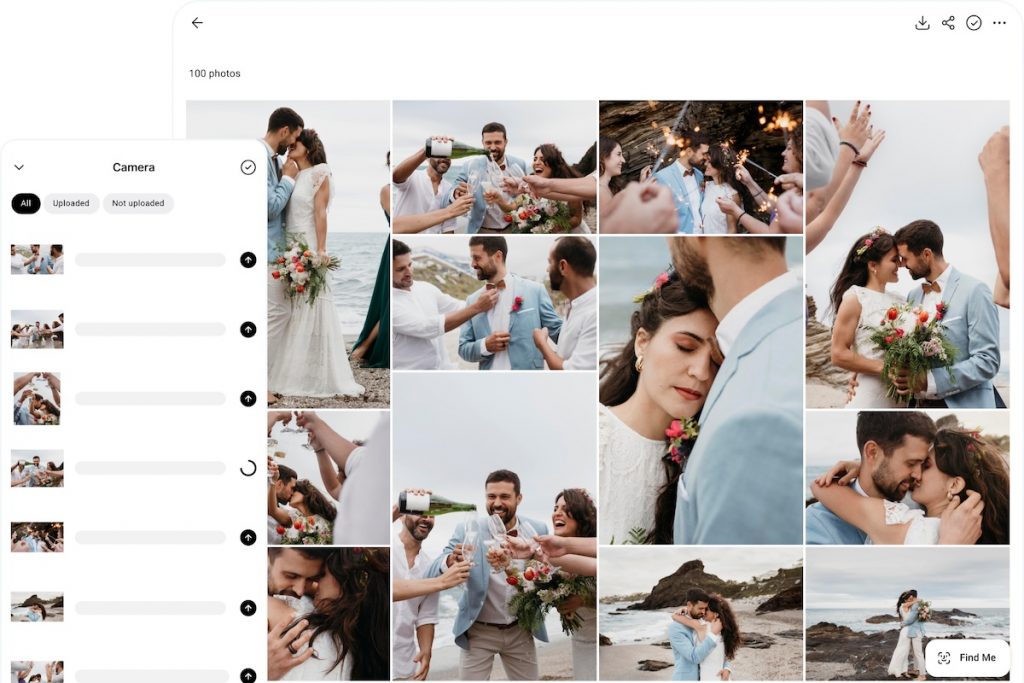 Instant photo delivery adds a powerful layer to the wedding day experience, and Honcho makes it simple to do in real time. Photos can be uploaded directly from camera to cloud, then shared instantly with face recognition, allowing guests to find their own photos within seconds. A live slideshow can also be displayed during the reception, turning freshly captured moments into part of the celebration itself.