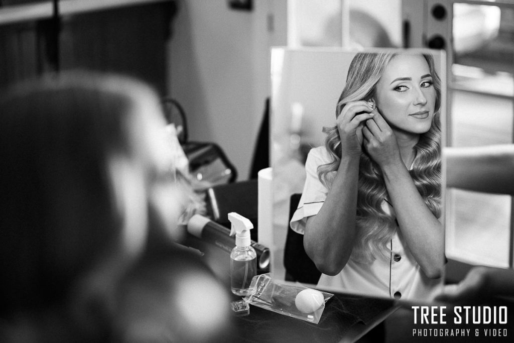 Photograph the bride putting on earrings while using a mirror to add an artistic perspective. Focus on her expression and the reflection to create depth and visual interest. The composition highlights preparation details while conveying a sense of anticipation and intimacy.