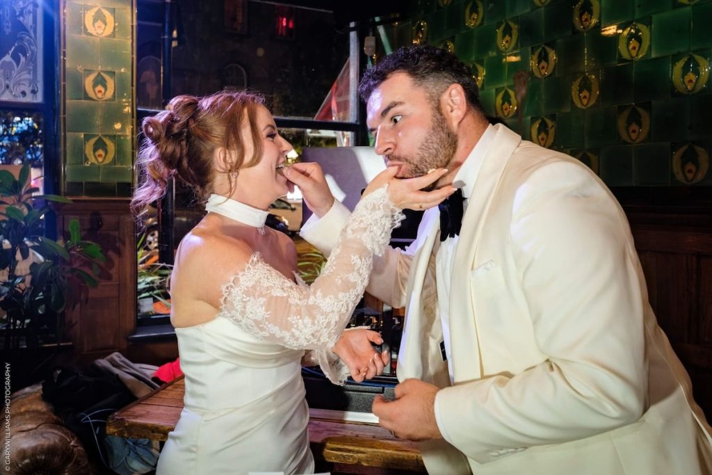 For this playful wedding photoshoot idea, capture the expressions as the couple feeds each other cake. Silly faces and laughter reveal their personality and ease, often breaking the formal tension. Staying close allows you to preserve the intimacy of the moment while keeping the frame lively and engaging.