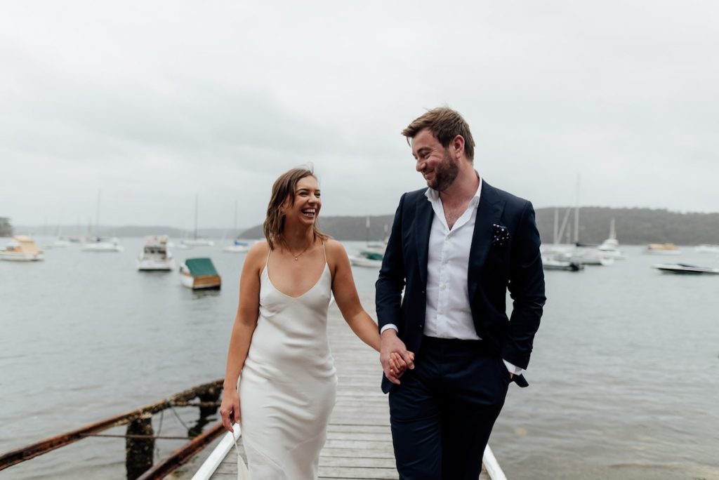 A lovely wedding photoshoot idea is to capture the bride and groom sharing a relaxed laugh while holding hands. Focus on their natural expressions and the warmth between them. Keep the framing simple and unobtrusive to highlight their connection and the joy of the moment.
