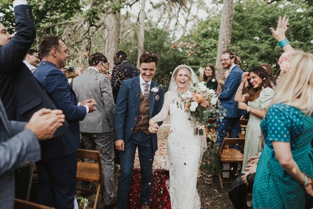 Capture the couple walking down the aisle as guests toss flower petals into the air. Use wide framing and embrace the motion to convey excitement and joy. Shooting in continuous mode increases the chance of catching perfect expressions, while the movement and lively atmosphere enhance the celebratory energy of the moment.