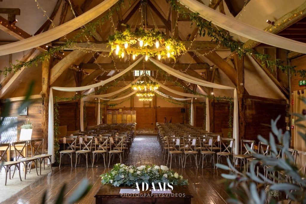 Shoot a wide view of the event space before the ceremony begins, highlighting the decorations and overall atmosphere. Emphasize elements such as the aisle, seating, florals, and backdrop to give a clear sense of place. Keep the composition clean and balanced to showcase the effort and detail put into creating the ceremonial setting.