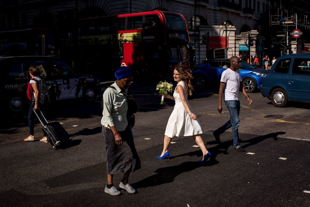 A creative pre-wedding photoshoot idea is to capture the bride or groom walking across a busy intersection in wedding attire, with or without a bouquet or veil. Focus on natural movement and posture, using the urban environment to add energy and storytelling to the frame. Keep the composition balanced to highlight both the couple and the lively city atmosphere.