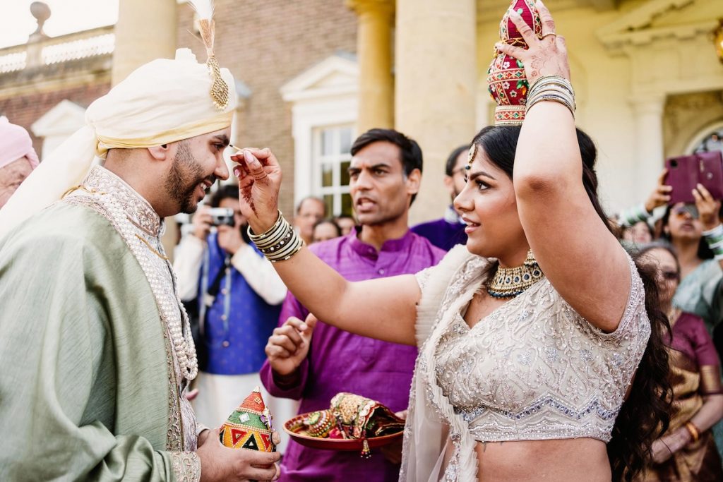 Capture the cultural aspects of the wedding, such as traditional attire, rituals, or ceremonial elements. Focus on the colors, textures, and meaningful gestures that reflect the heritage and significance of the occasion. Keep the composition respectful and detailed to celebrate the culture while capturing authentic moments.