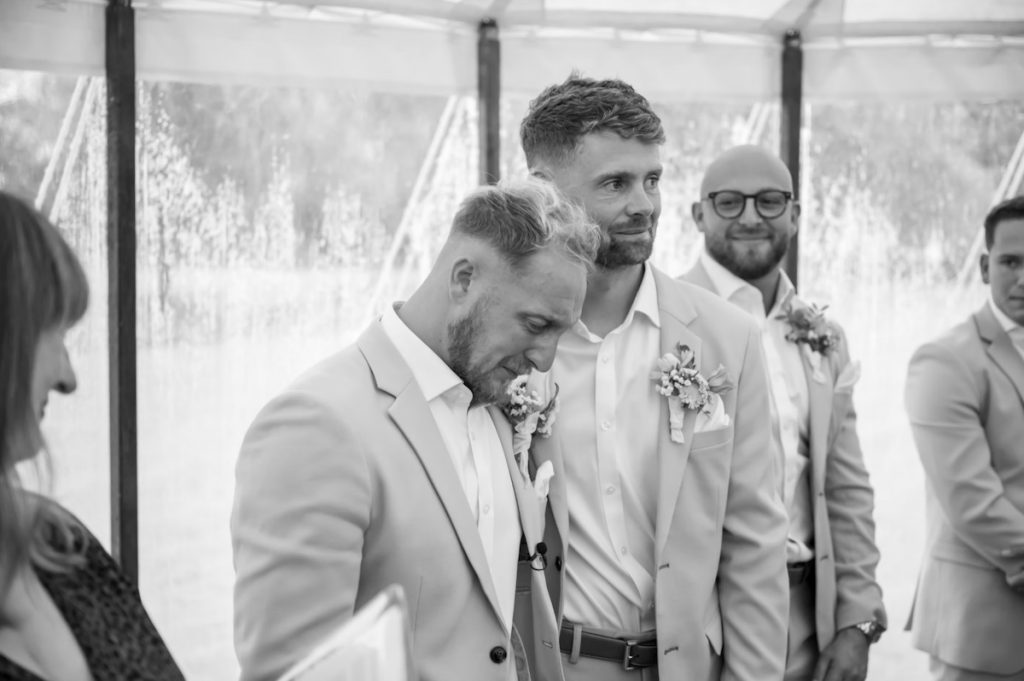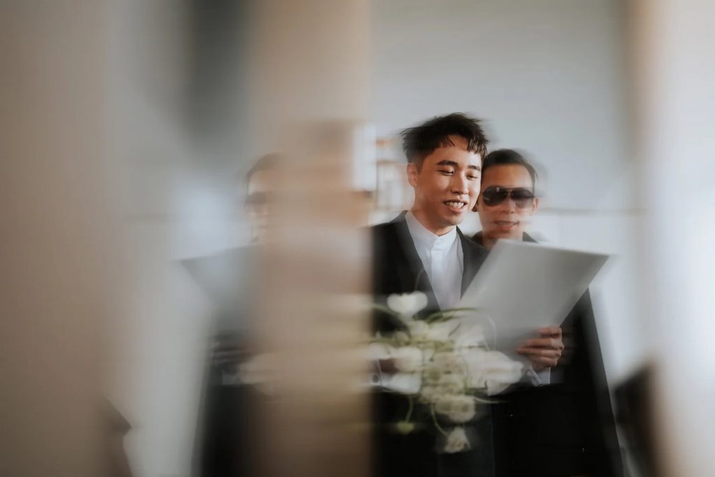 Photograph the groom as he rehearses his vows, with his best man close by. Look for expressions of focus, excitement, or nervous laughter to highlight the personal, behind-the-scenes moments of the day. Keep the composition relaxed and natural to convey the authenticity and anticipation leading up to the ceremony.