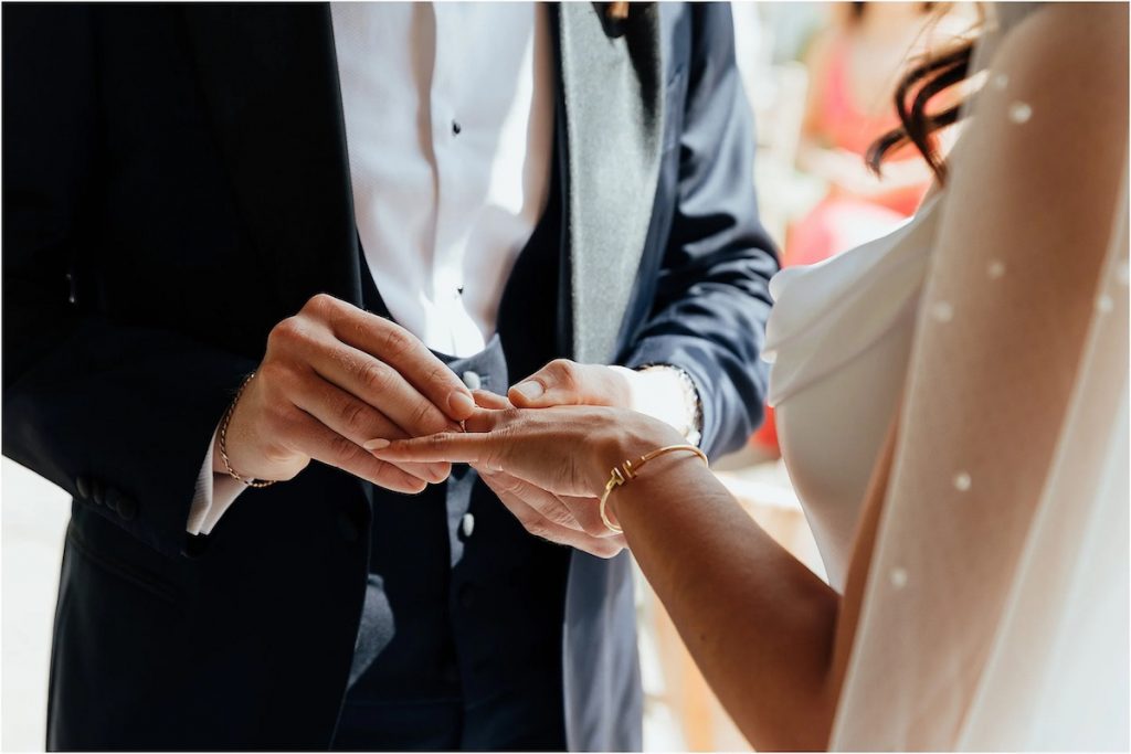 Photograph a close-up of the moment the groom places the ring on the bride’s finger. Tight framing emphasizes the hands, the rings, and the subtle emotions conveyed through their gestures. This intimate focus highlights the significance of the commitment while keeping the scene personal and heartfelt.