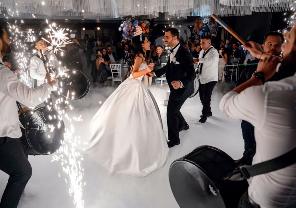 For this wedding photography idea, capture the couple’s first dance from a stage or elevated perspective to include both the bride and groom as well as the guests. Focus on expressions, movements, and reactions to convey the energy and emotion of the moment. Wide framing helps showcase the atmosphere while keeping the couple as the central focus.