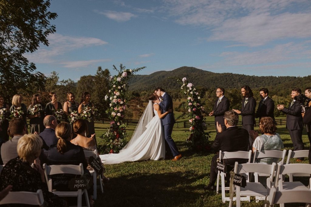 Capture the couple’s first kiss after the vows with a wide shot that also includes the reactions of guests, the best man, and bridesmaids. Pay attention to the joy and emotion on the surrounding faces to amplify the significance of the moment. Maintain a balanced composition to highlight both the intimacy of the kiss and the celebratory energy around them.