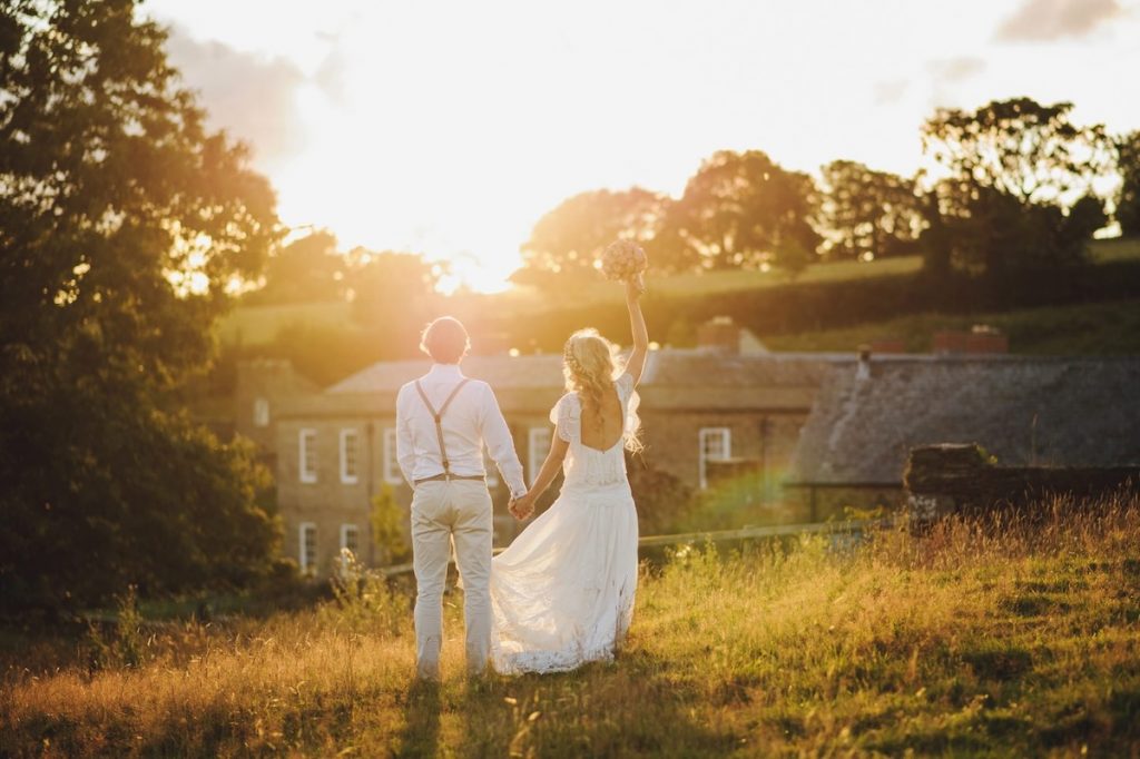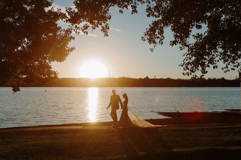 Capture the bride and groom holding hands as they walk during sunset. Highlight their connection and the warm, golden light to create a romantic, serene atmosphere. Use wide framing or natural leading lines to enhance the composition and showcase the beauty of the moment.