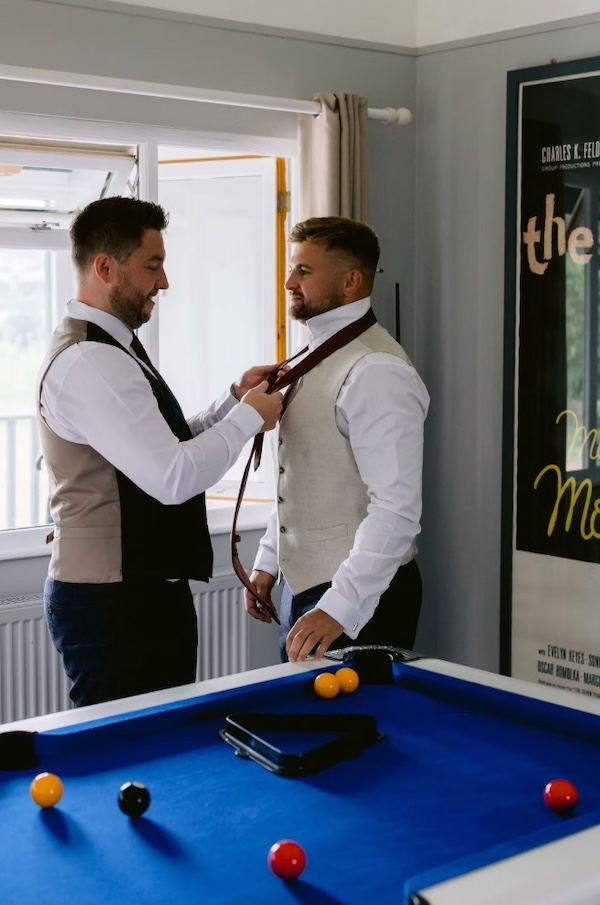 Look for candid moments during the groom’s preparations, such as the best man helping him tie his tie or adjust his jacket. Pay attention to their interaction and subtle expressions to highlight the camaraderie and support between them. A simple, natural composition keeps the focus on these genuine behind-the-scenes moments that add depth to the wedding story.