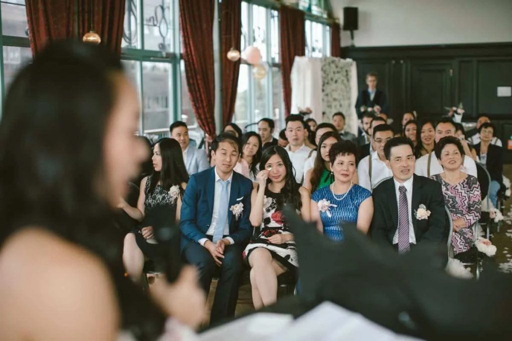 Position yourself at the front of the stage to capture parents, family, and close friends. Their reactions—tears, smiles, and attentive gazes—add emotional context to the ceremony and show how significant the moment is to those nearest the couple. Including multiple layers of faces in the background can also create visual depth and richness.