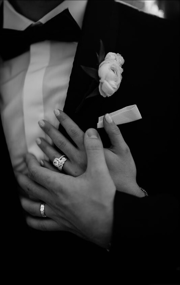 For this wedding photoshoot idea, position the bride’s hands on the groom’s chest to highlight the rings and the softness of the gesture. Use a tight frame to emphasize intimacy and symbolism, and work with soft, flattering light so the focus remains on their connection rather than the environment.