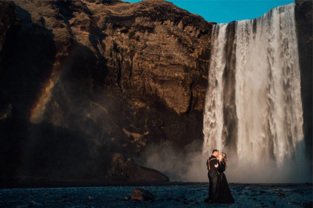 A great pre-wedding photoshoot idea is to incorporate natural elements like waterfalls or rainbows. Use the environment to frame the couple and create a sense of scale. Wide compositions work well to showcase the landscape, setting the tone and mood for the shoot.